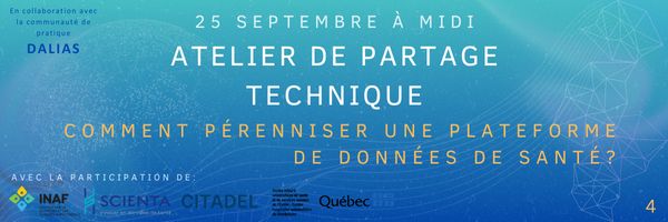 En partenariat avec Le Fonds de recherche du Québec (FRQ), en collaboration avec le Ministère de la Santé et des Services sociaux du Québec (MSSS) (MSSS), le Ministère de l’Économie, de l’Innovation et de l’Énergie du Québec (MEIE) et le comité organisateur de la communauté de pratique DALIAS.